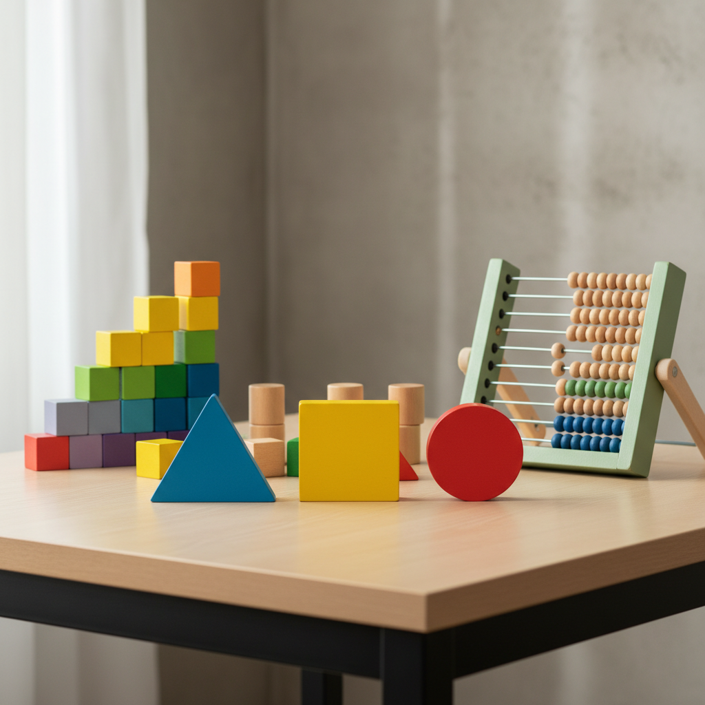 Kai vaikas mokosi sudėties ar atimties, naudokite šiuos daiktus. Pavyzdžiui, norėdami paaiškinti užduotį 4+3, padėkite keturias kaladėles, tada pridėkite dar tris ir paprašykite vaiko viską suskaičiuoti kartu. Tokiu būdu vaikas mato procesą, o ne tik užrašytus skaičius popieriuje. Kai vaikas perpranta principą naudodamasis daiktais, jis lengviau pereina prie abstrakčių skaičiavimų galvoje.